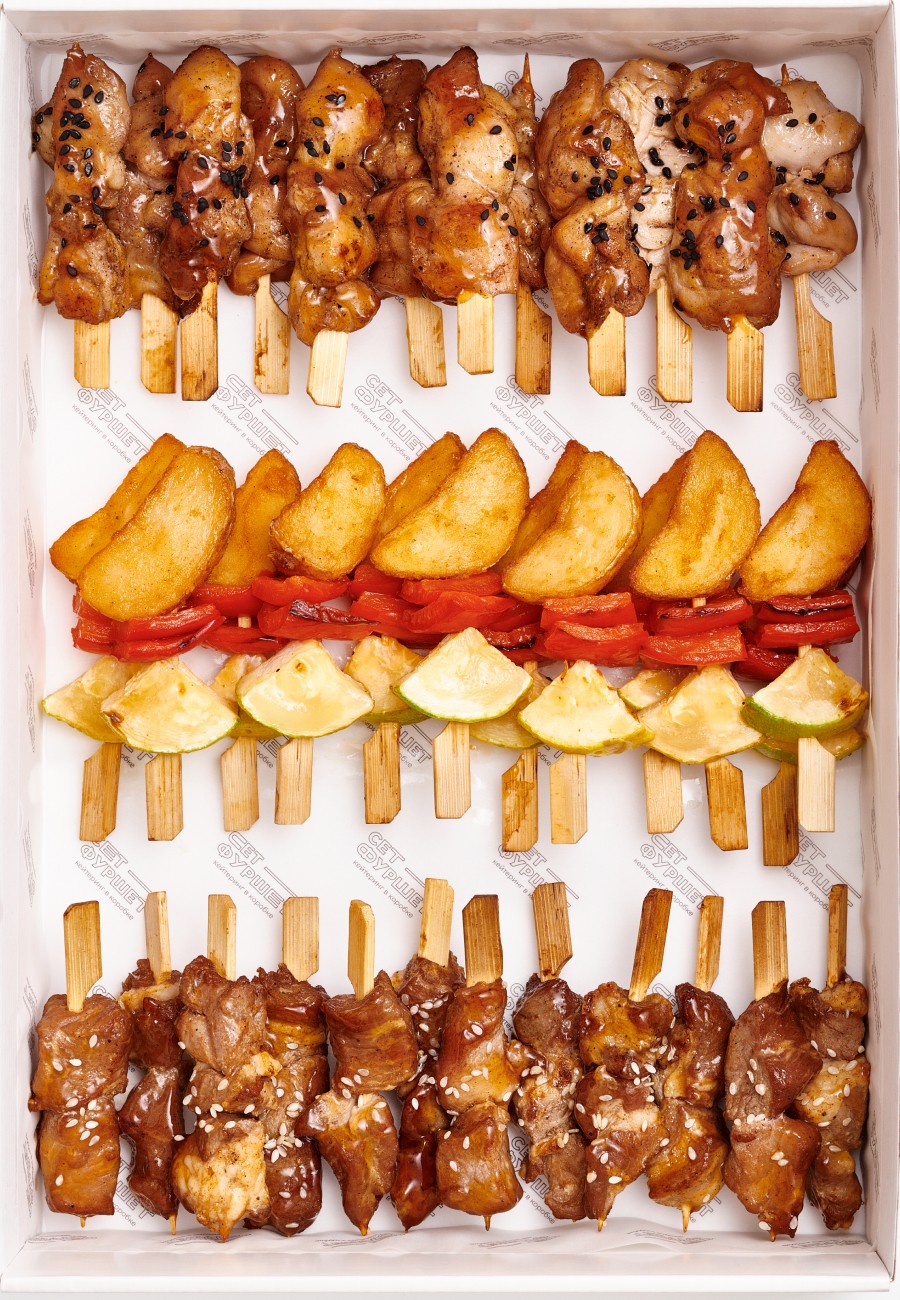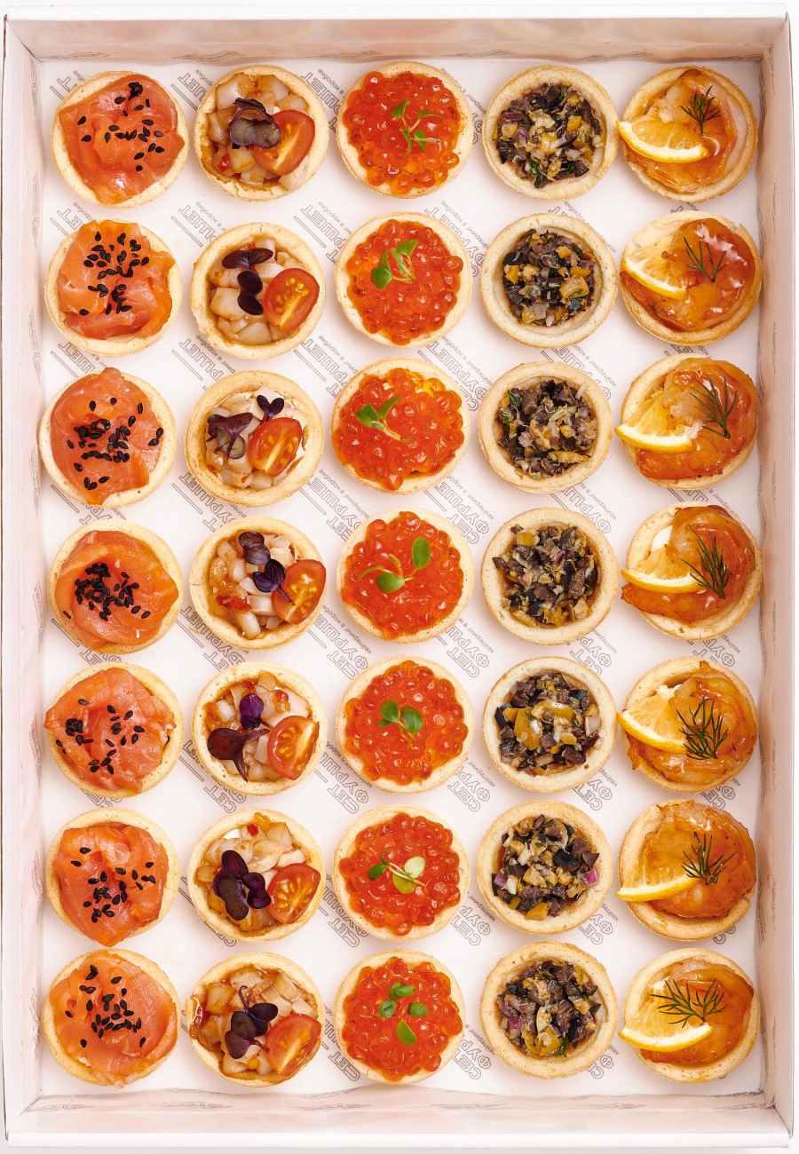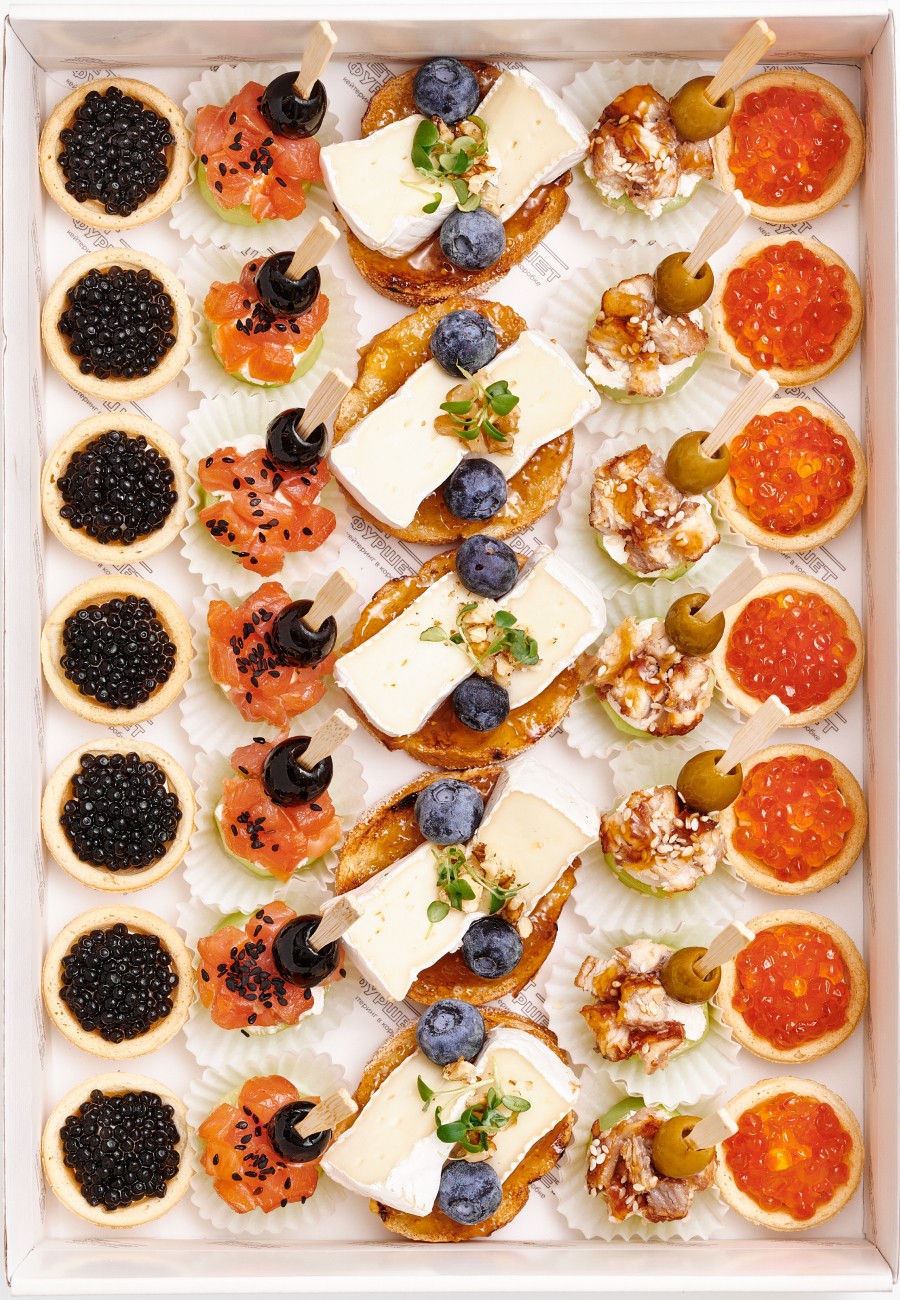 Мини-шашлычок, ассорти канапе и разные порционные десерты представлены в меню кейтеринга в коробках.